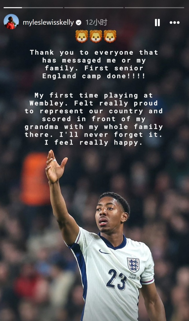 斯凱利寫道:“感謝所有為我和我的家人送上問候的人,首次英格蘭一線隊之旅結(jié)束了!??!這是我第一次在溫布利球場踢球。能為國出戰(zhàn),并在奶奶和全家面前進球,我倍感驕傲。我永遠不會忘記,也感到非常開心?!?/p>