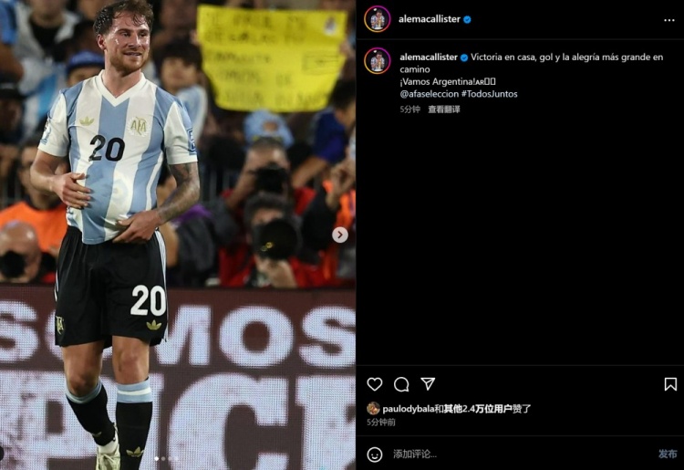 3月26日訊 南美區(qū)世預(yù)賽本輪比賽中,阿根廷主場(chǎng)4-1大勝宿敵巴西。賽后,麥卡利斯特更新社媒,慶祝獲勝。