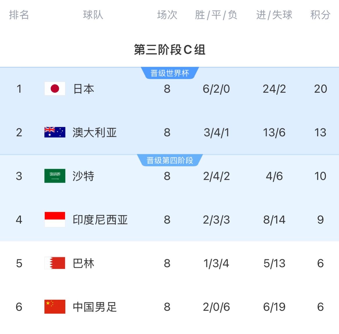 目前C組積分榜中,日本隊(duì)積20分提前晉級(jí),澳大利亞隊(duì)積13分位列第二,沙特阿拉伯隊(duì)積10分排名第三,印度尼西亞隊(duì)積9分排名第四,巴林隊(duì)和中國隊(duì)積6分小組墊底。根據(jù)世預(yù)賽規(guī)則,18強(qiáng)賽小組前兩名直通美加墨世界杯,第三名和第四名將參加下一階段附加賽。中國隊(duì)已無緣直通名額,只能競(jìng)爭(zhēng)小組前四,爭(zhēng)取進(jìn)入附加賽。