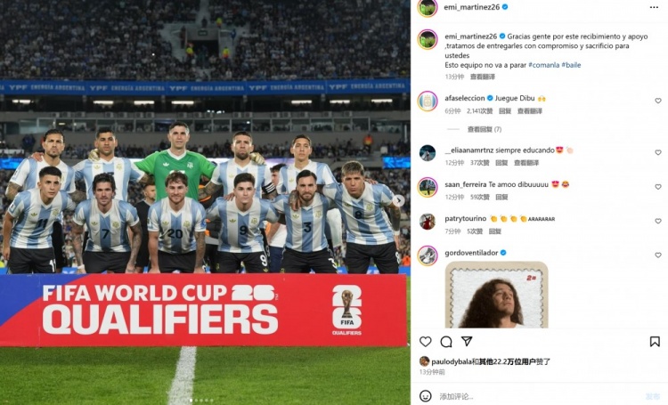 阿根廷門(mén)將馬丁內(nèi)斯也在社媒曬出本場(chǎng)球隊(duì)首發(fā)合影,配文寫(xiě)道:“感謝大家的熱情支持,我們?cè)趫?chǎng)上努力付出一切,這支球隊(duì)永不會(huì)停下腳步!”