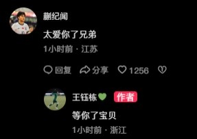 他在U20國足的隊友蒯紀(jì)聞留言“太愛你了兄弟”,王鈺棟則調(diào)侃回復(fù)“(國家隊)等你了寶貝”。