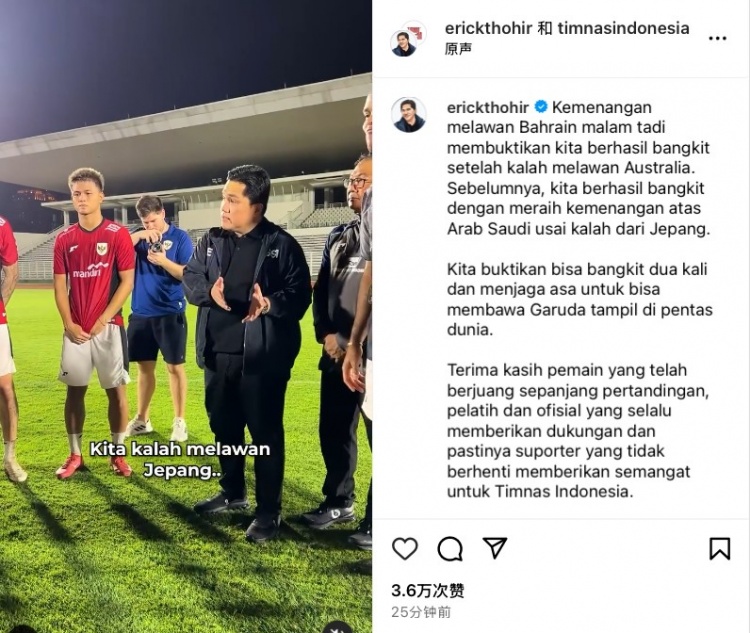 托希爾為這條Vlog配文寫道:“昨晚與巴林隊(duì)的勝利,顯示我們已經(jīng)從慘敗澳大利亞的比賽中振作起來,而此前我們也在客場(chǎng)慘敗日本隊(duì)后,主場(chǎng)擊敗沙特重新振作。我們證明了自己兩度跌倒,兩度爬起,希望我們能繼續(xù)努力,讓印尼足球在世界舞臺(tái)上展現(xiàn)自己?!?/p>