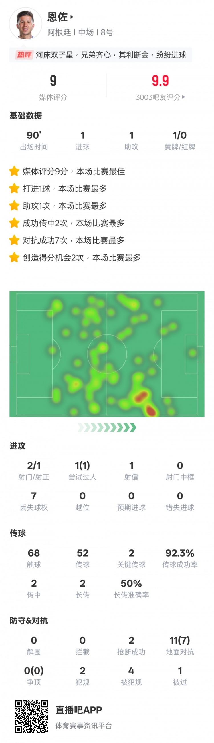 恩佐本場(chǎng)比賽數(shù)據(jù)如下: