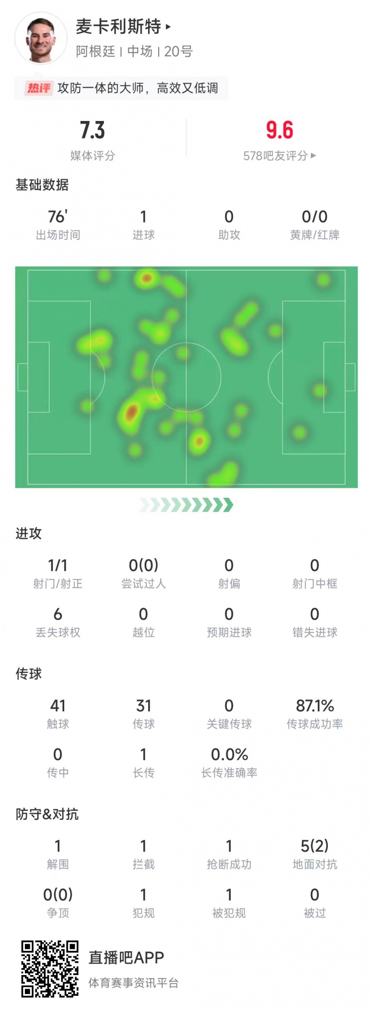 麥卡利斯特本場比賽數(shù)據(jù):