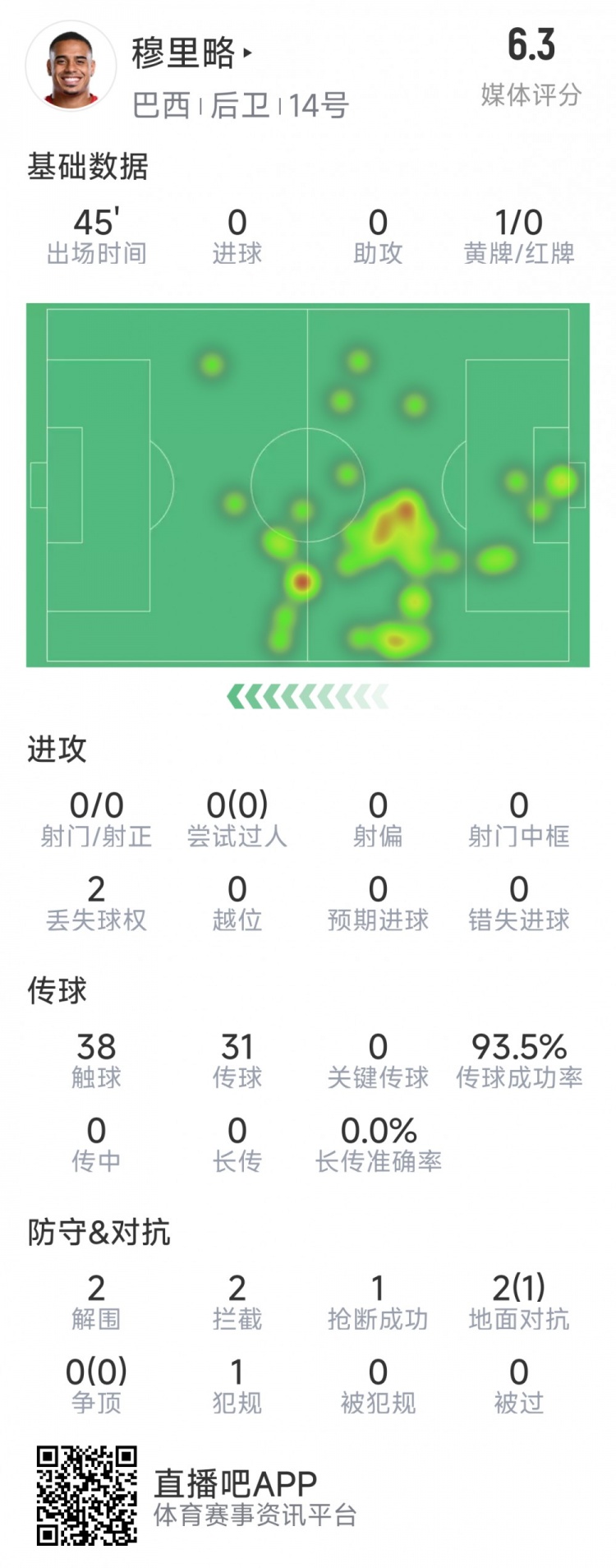 - 半場被換下,穆里略本場數(shù)據(jù):兩次烏龍助攻,2解圍&2攔截