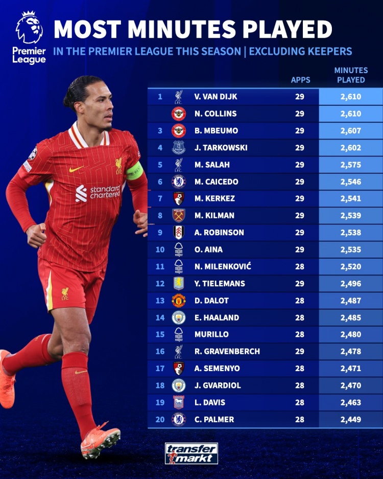 3月27日訊 德轉(zhuǎn)統(tǒng)計(jì)了本賽季出場(chǎng)時(shí)間最多的20名英超外場(chǎng)球員(即非門將球員)。其中,范迪克和科林斯打滿29場(chǎng)比賽居首,薩拉赫第5、凱塞多第6。