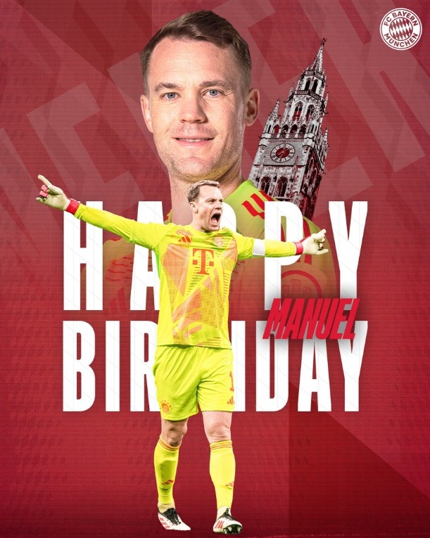 3月27日訊 德國隊和拜仁官方社媒更新動態(tài),為諾伊爾送上生日祝福。