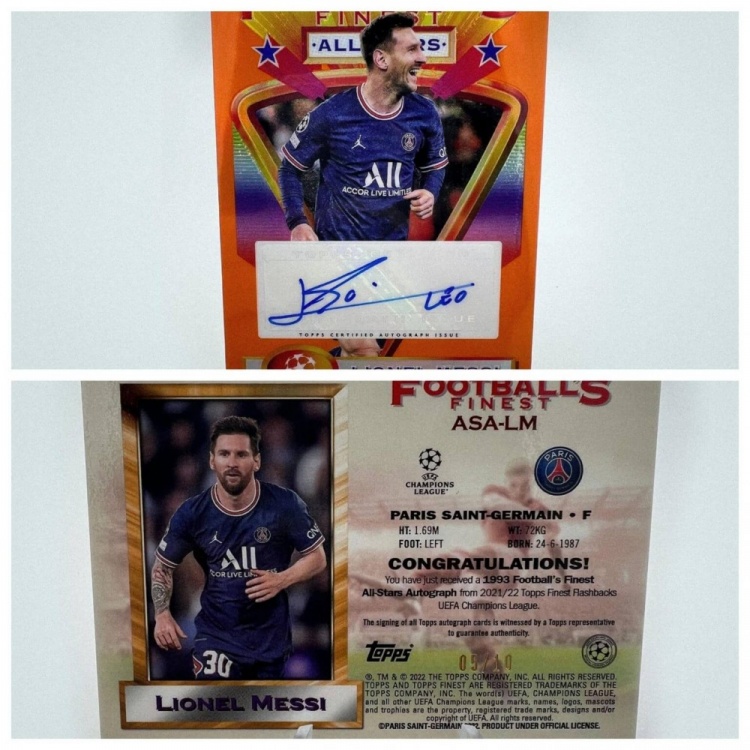 這張2021-22賽季Topps Finest Flashbacks UEFA Champions League Football’s Finest全明星簽名橙折射卡,全球僅印制10張。正面小字標(biāo)注著“Topps認(rèn)證簽名版本”??ㄆ趁孢€提供了更多保證:“所有Topps簽名卡的簽署過(guò)程均有Topps代表現(xiàn)場(chǎng)監(jiān)督,確保真實(shí)性?!边@張卡片潛在價(jià)值超過(guò)1000美元。