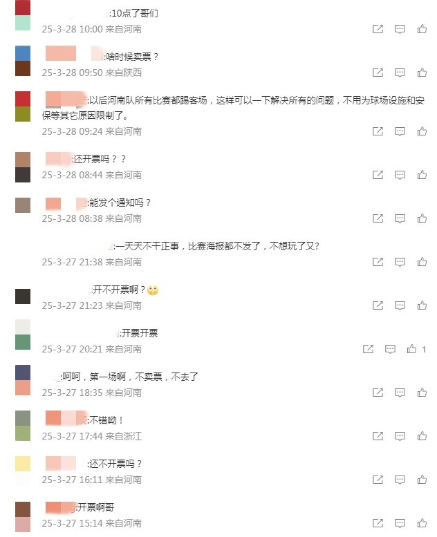 根據(jù)賽程安排,河南隊(duì)將在本輪聯(lián)賽主場(chǎng)對(duì)陣上海申花,比賽時(shí)間為3月29日(星期六)18:00。在賽前僅剩一天的時(shí)候,俱樂(lè)部仍未售票,也沒(méi)有相關(guān)公告,這讓球迷等得非常急迫。在河南隊(duì)官方微博的評(píng)論區(qū),球迷們?cè)诔掷m(xù)催促售票。