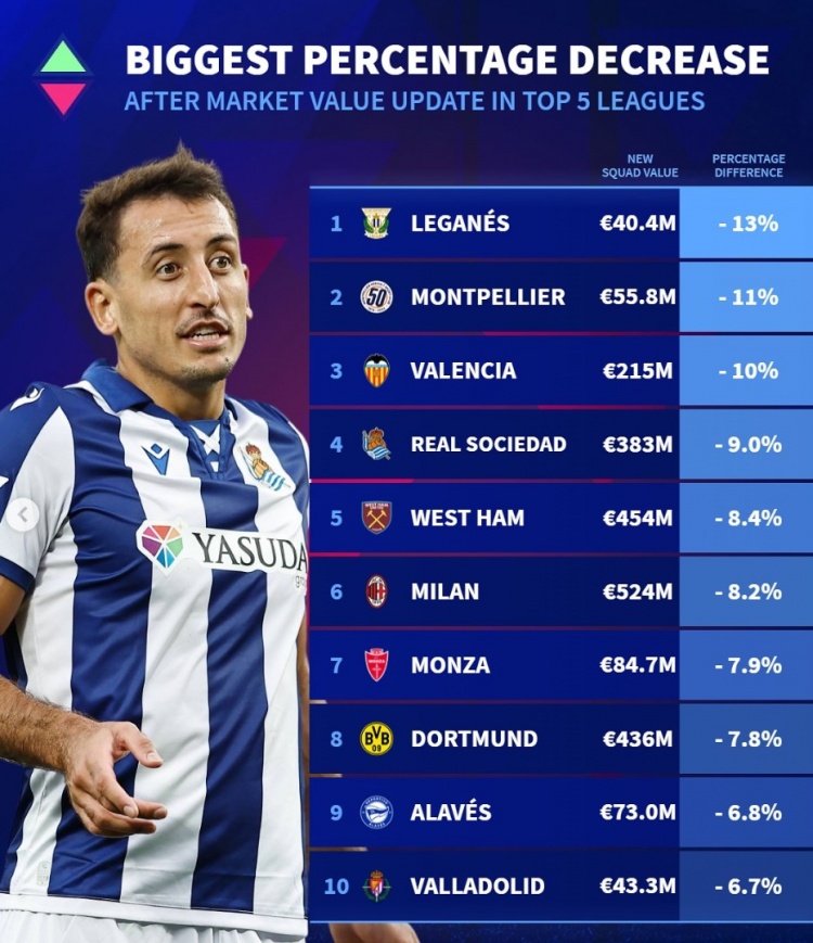 - 五大聯(lián)賽球隊身價貶值比例榜:米蘭多特下降約8%,皇社西漢姆在列