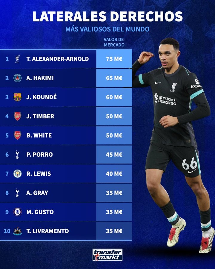 皇馬又免簽了個硬菜?德轉(zhuǎn)列右后衛(wèi)身價:阿諾德7500萬歐居首