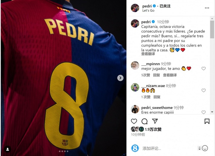 全場最佳!佩德里社媒:擔(dān)任隊長+西甲8連勝,三分獻(xiàn)給巴薩球迷