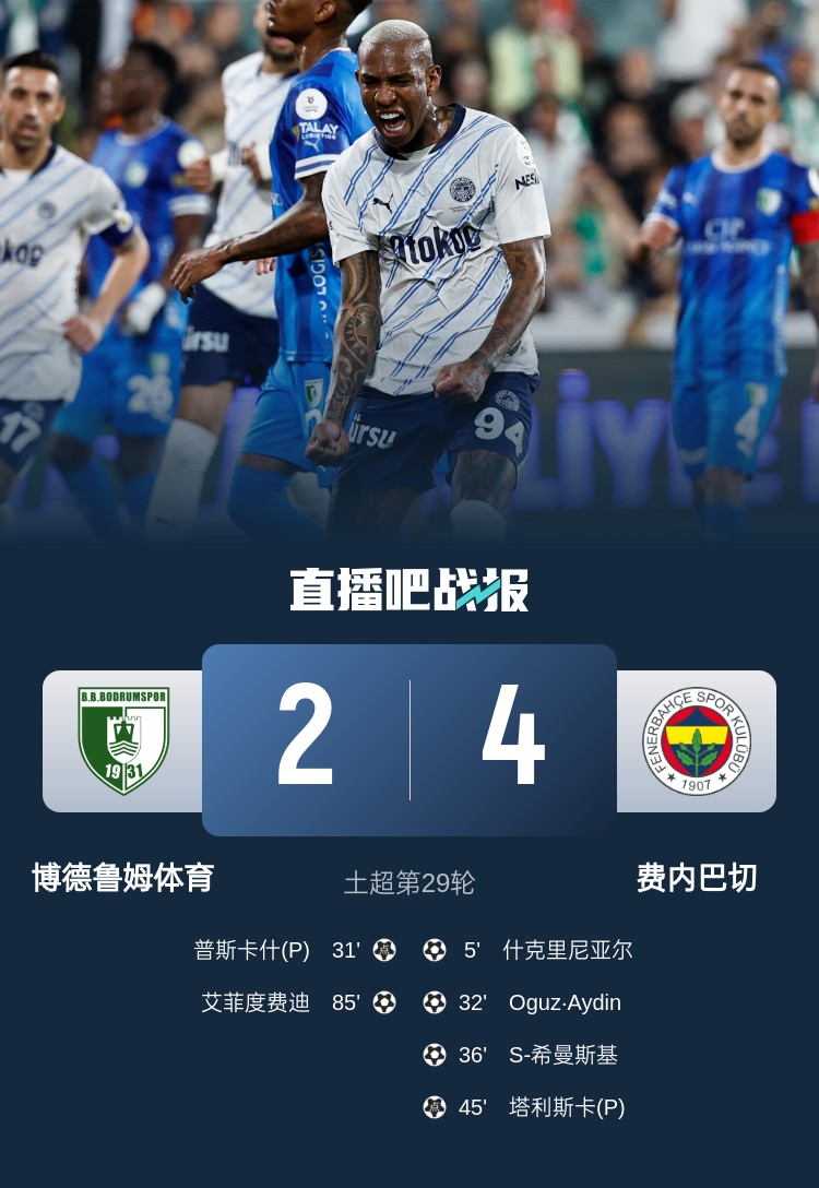 13輪不??!費內(nèi)巴切4-2博德魯姆體育距榜首6分 塔利斯卡點射+送點