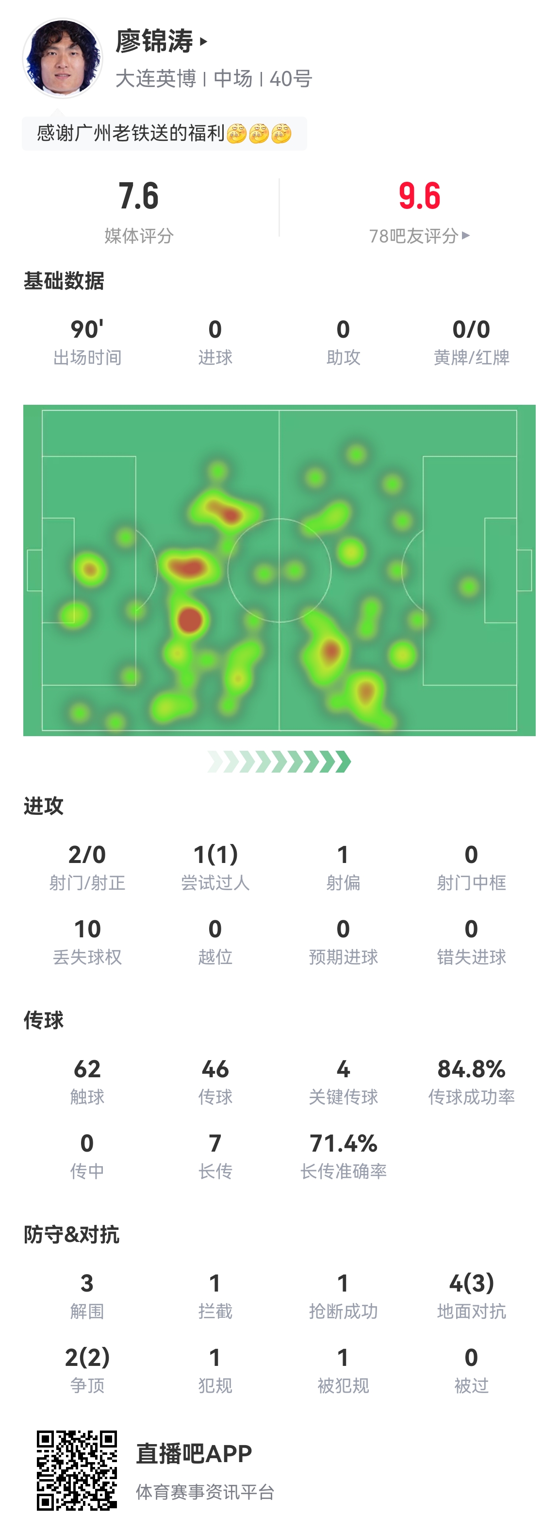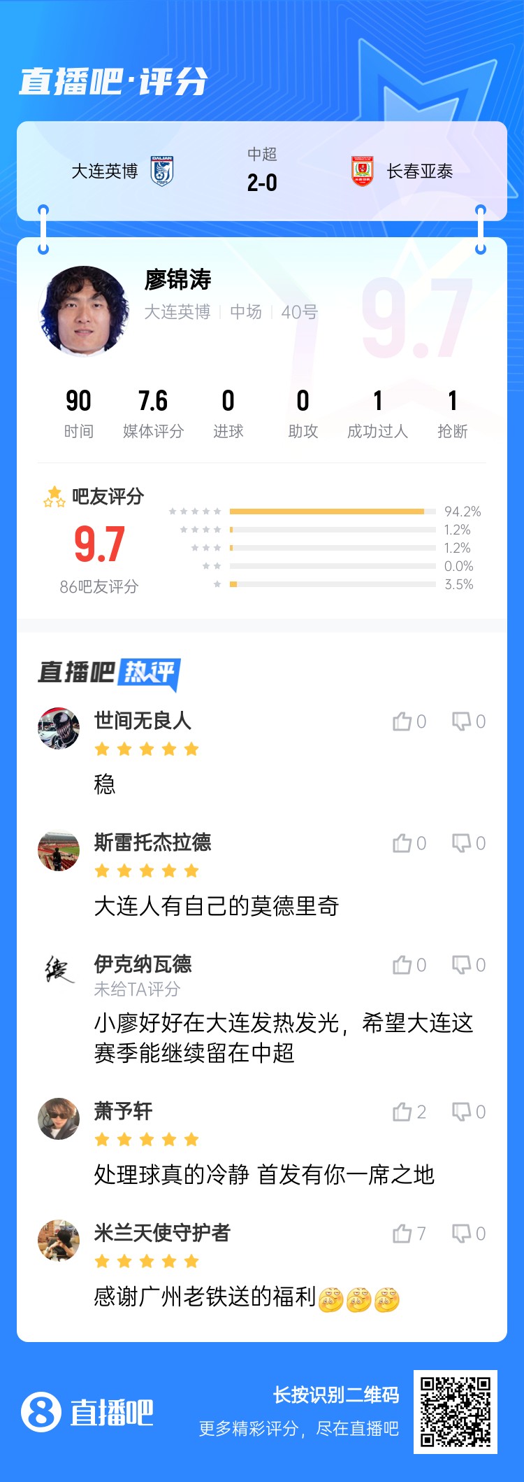 - 伊萬考慮下?大連英博單后腰廖錦濤攻防一體,吧友打分9.6分!