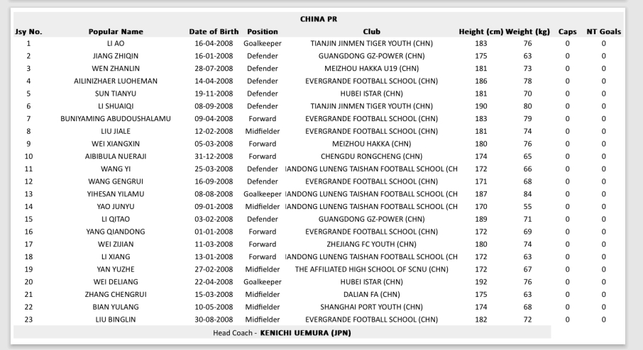 03月29日訊 亞足聯(lián)官方公布U17亞洲杯各隊(duì)23人名單,中國隊(duì)名單中艾比布拉領(lǐng)銜,魏祥鑫、布尼亞明在列。這支U17國足由上村健一掛帥,近期在迪拜集訓(xùn)期間,球隊(duì)共打了4場熱身賽,均失利。