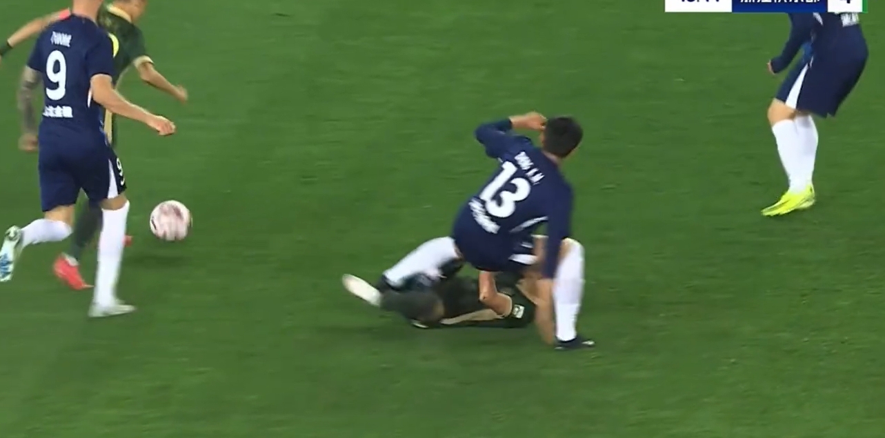在比賽第47分鐘,鄭凱木從身后別倒王鈺棟,同時在王鈺棟倒地后,鄭凱木落地正好踩中王鈺棟腳踝,王鈺棟痛苦倒地,隨后受傷下場。