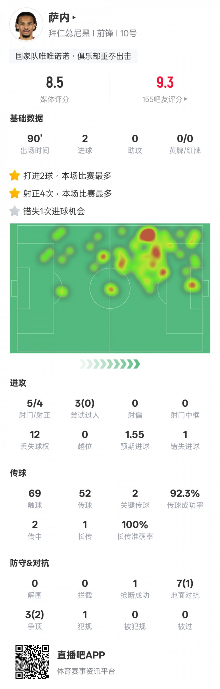 薩內(nèi)本場(chǎng)數(shù)據(jù):2進(jìn)球2關(guān)鍵傳球&錯(cuò)失1次進(jìn)球機(jī)會(huì),評(píng)分8.5
