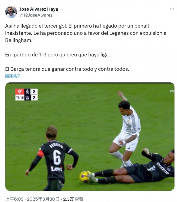 對此西班牙六臺巴薩跟隊(duì)記者Jose Alvarez Haya在社交媒體上寫道:“伯納烏的丑聞,判罰了一個不存在的點(diǎn)球(指居勒爾倒地獲點(diǎn))?!?/p>