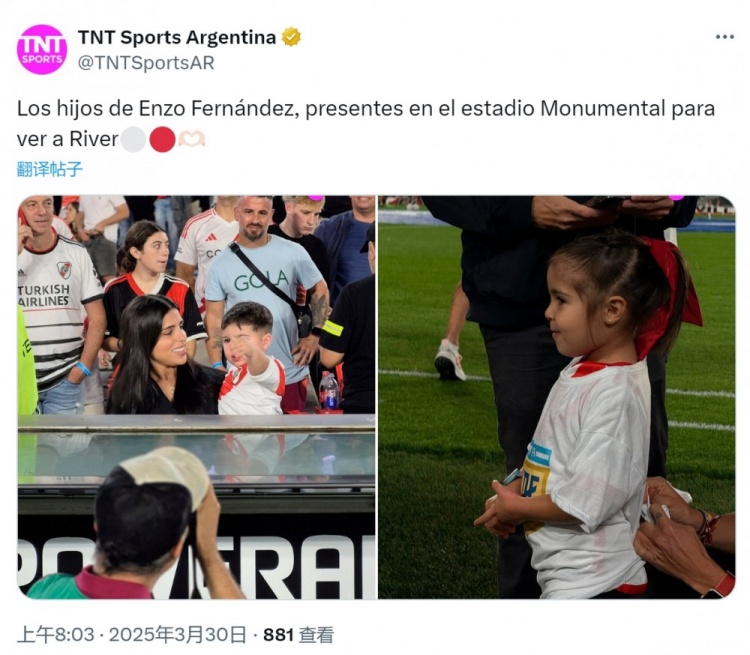 - 恩佐女友帶著孩子來到紀(jì)念碑球場,現(xiàn)場觀看恩佐母隊河床比賽
