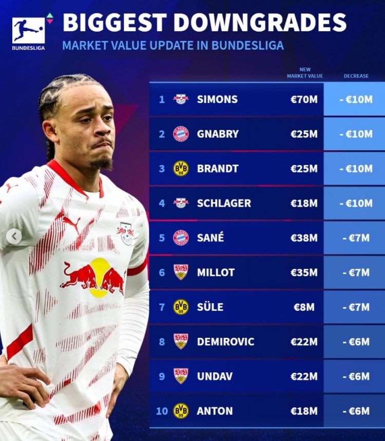 - 德甲身價(jià)貶值榜:西蒙斯&格納布里下跌1000萬(wàn),薩內(nèi)&聚勒降700萬(wàn)
