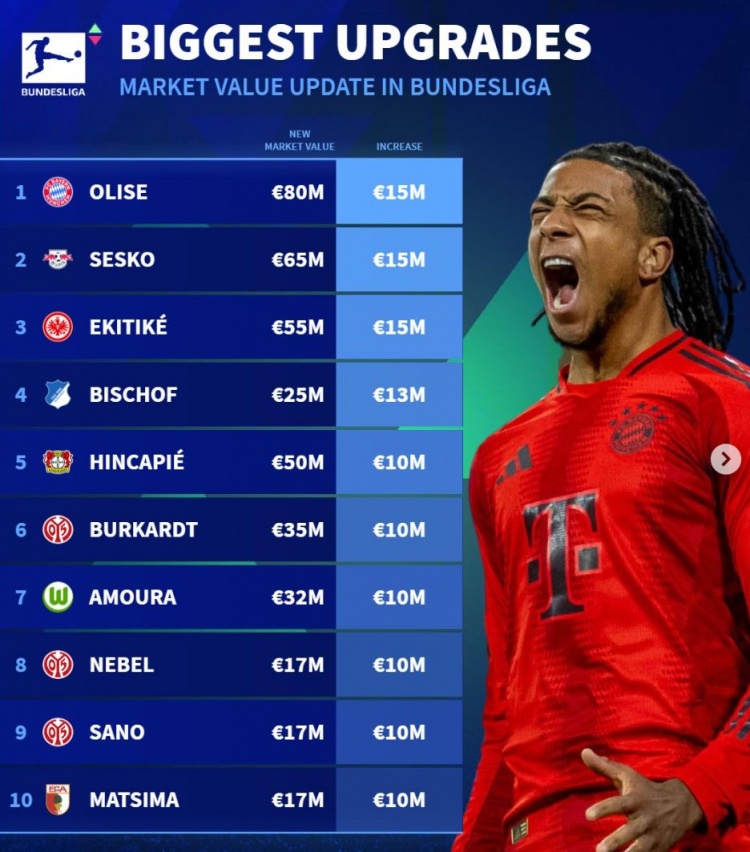 3月30日訊 《轉(zhuǎn)會(huì)市場(chǎng)》在此前更新了德甲球員身價(jià),并列出了身價(jià)升值幅度最大情況,奧利塞等3人領(lǐng)銜。