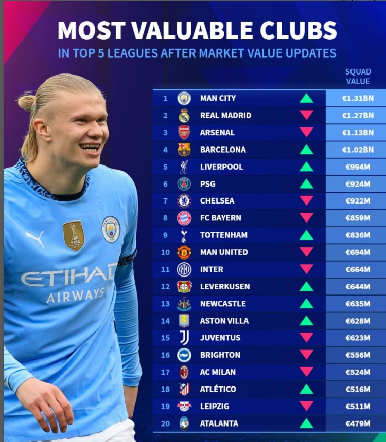 - 五大聯(lián)賽球隊(duì)最新身價(jià)榜:曼城壓皇馬居首,阿森納、巴薩分列三四