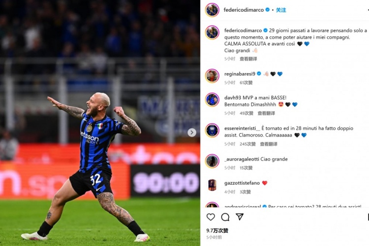 迪馬爾科也在賽后通過社媒曬出了自己的慶祝照并配文:“過去29天我都在想著這樣的時刻,只想著我如何才能夠幫助到隊友。保持冷靜,繼續(xù)前進????????各位再會!”