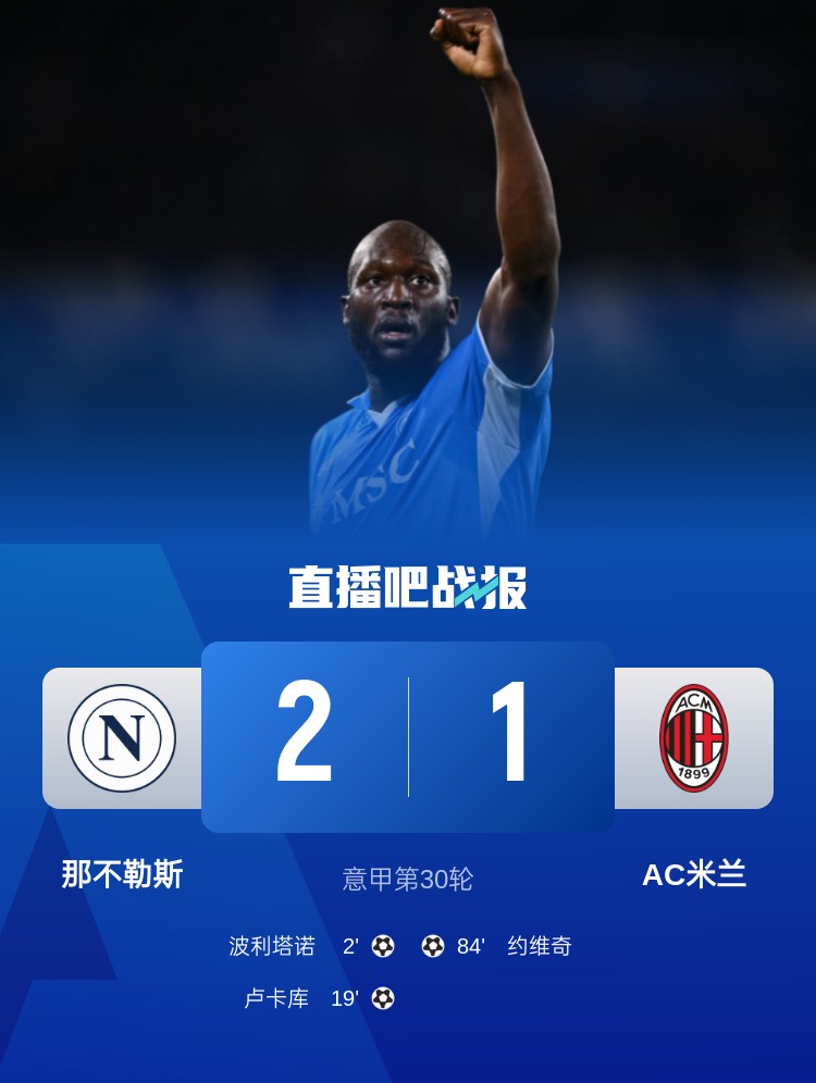 意甲第30輪,那不勒斯2-1AC米蘭,波利塔諾開場(chǎng)閃擊,盧卡庫(kù)破門。