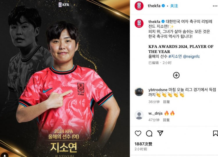 - 官方:34歲韓國(guó)女足名將池笑然當(dāng)選韓足協(xié)2024年度最佳女足球員
