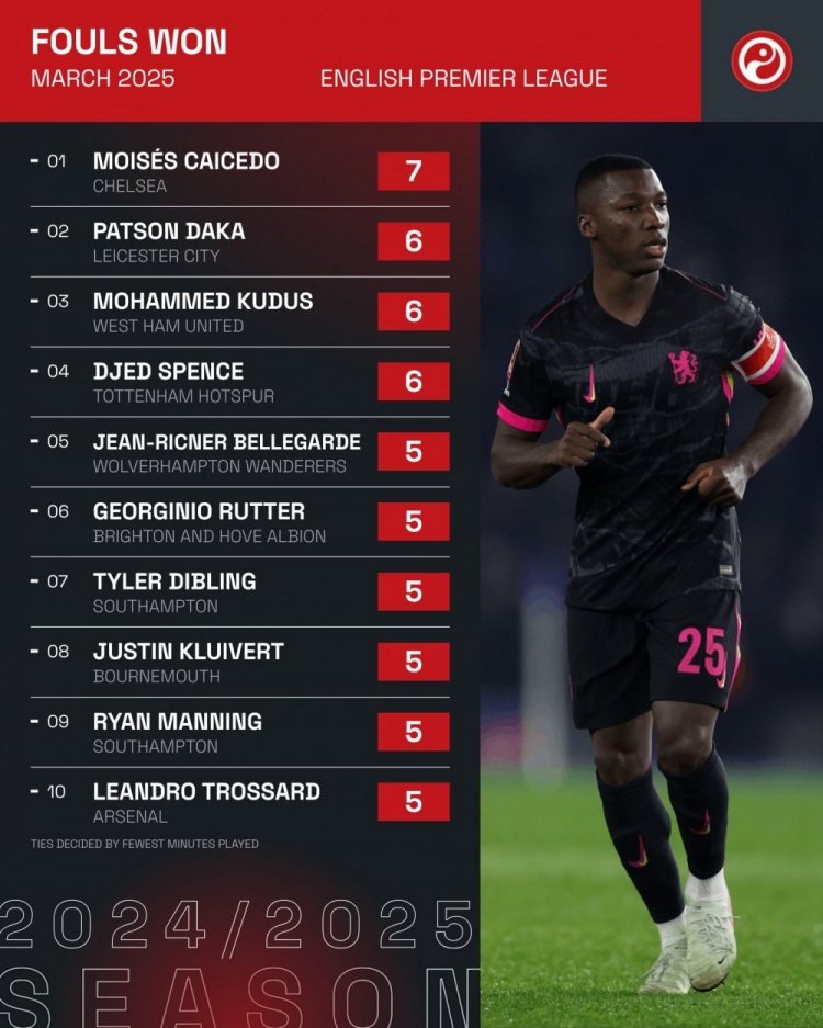 - 英超3月制造犯規(guī)次數(shù)榜:凱塞多7次居首,庫杜斯6次&特羅薩德5次