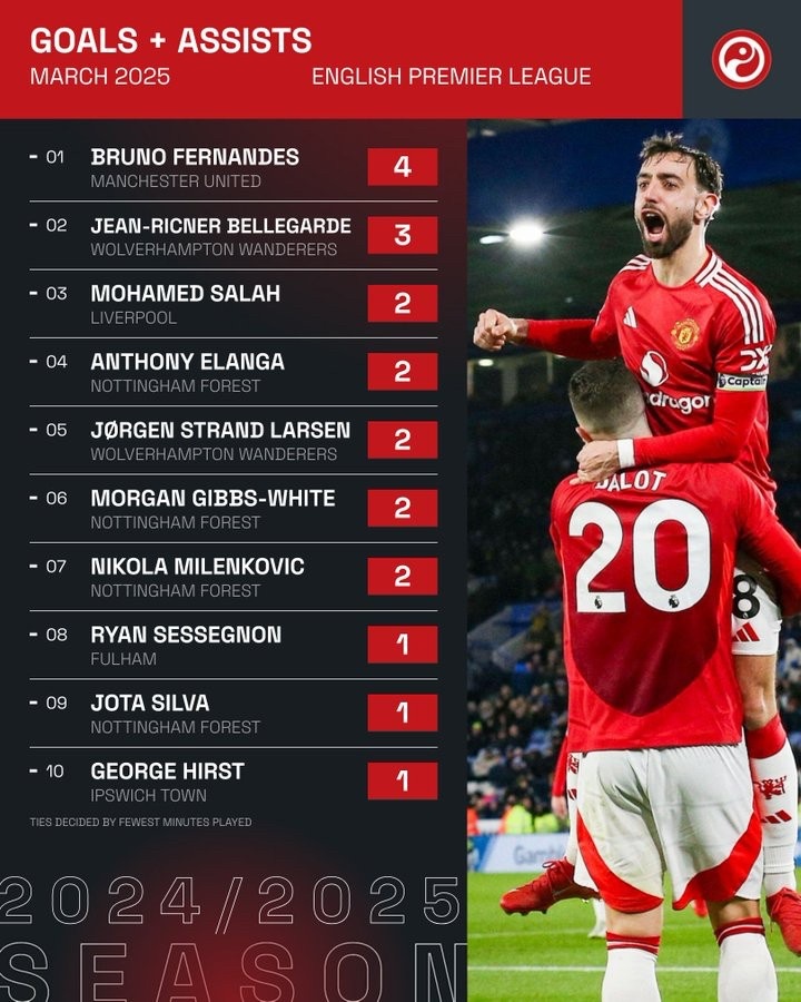 - 英超第一!B費(fèi)參與了曼聯(lián)在三月份英超比賽中的所有進(jìn)球
