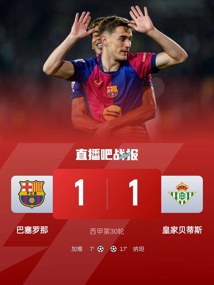 西甲第30輪,巴薩1-1貝蒂斯,聯(lián)賽九連勝終結(jié)。上半場,費(fèi)蘭-托雷斯助攻加維破門,納坦扳平;下半場,兩隊(duì)均未改寫比分。