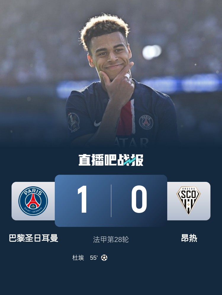 法甲第28輪,巴黎圣日耳曼主場1-0擊敗昂熱,提前6輪鎖定冠軍。上半場,帕喬破壞單刀,維蒂尼亞遠(yuǎn)射造險(xiǎn);下半場,克瓦拉茨赫利亞助攻杜埃搶點(diǎn)破門。