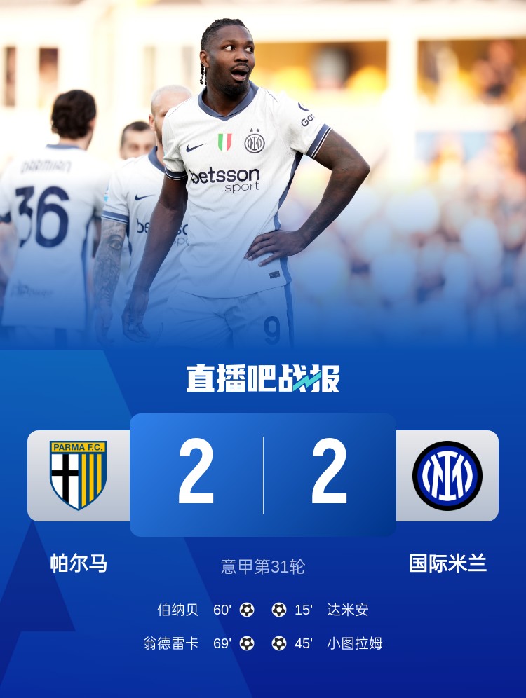 意甲第31輪,國米客場2-2帕爾馬。上半場,達(dá)米安勁射破門,小圖拉姆搶點(diǎn)建功;下半場,伯納貝遠(yuǎn)射扳回一城,翁德雷卡抽射變線入網(wǎng)扳平。