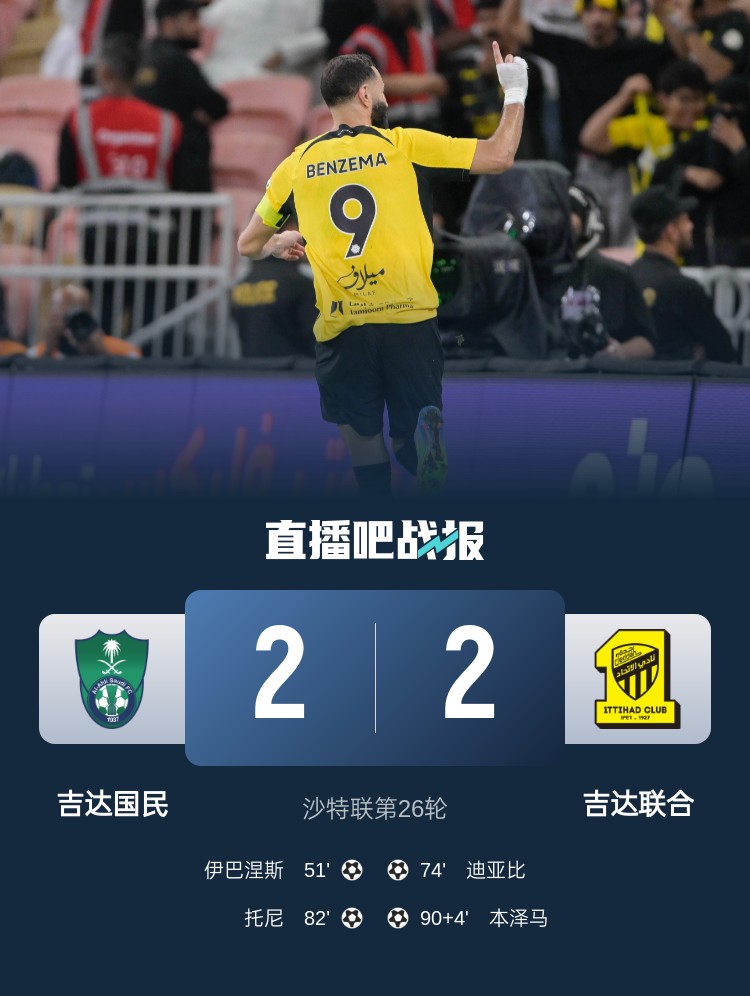 沙特聯(lián)-吉達(dá)聯(lián)合2-2吉達(dá)國民5分領(lǐng)跑 本澤馬絕平坎特失空門+送禮