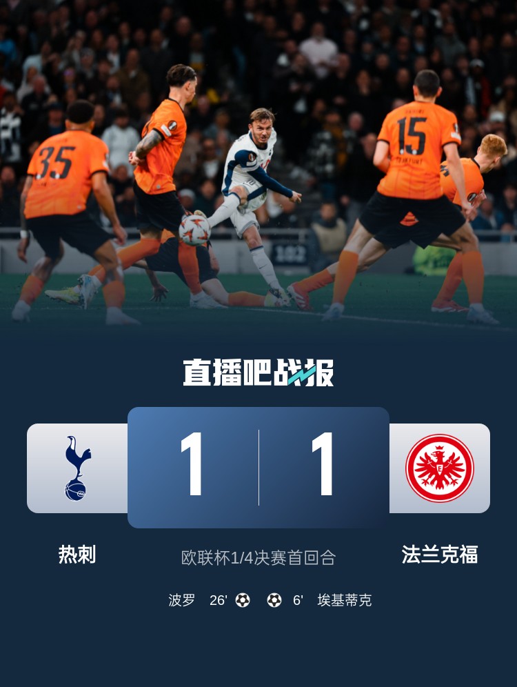 ?;倏耸组_紀(jì)錄,波羅扳平比分,最終熱刺首回合1-1戰(zhàn)平法蘭克福。