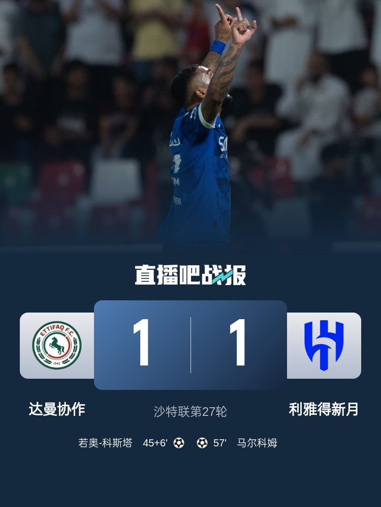 沙特聯(lián)第27輪,利雅得新月1-1達(dá)曼協(xié)作。上半場,若奧-科斯塔再補(bǔ)時最后時刻世界波破門;下半場,洛迪助攻馬爾科姆破門扳平比分。