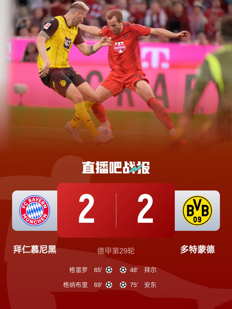 拜仁2-2多特6分領(lǐng)跑 格納布里一條龍破門金玟哉漏人致丟球
