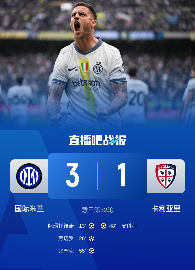 意甲第32輪,國米3-1卡利亞里,阿瑙托維奇?zhèn)魃洌瑒谒_進(jìn)球。