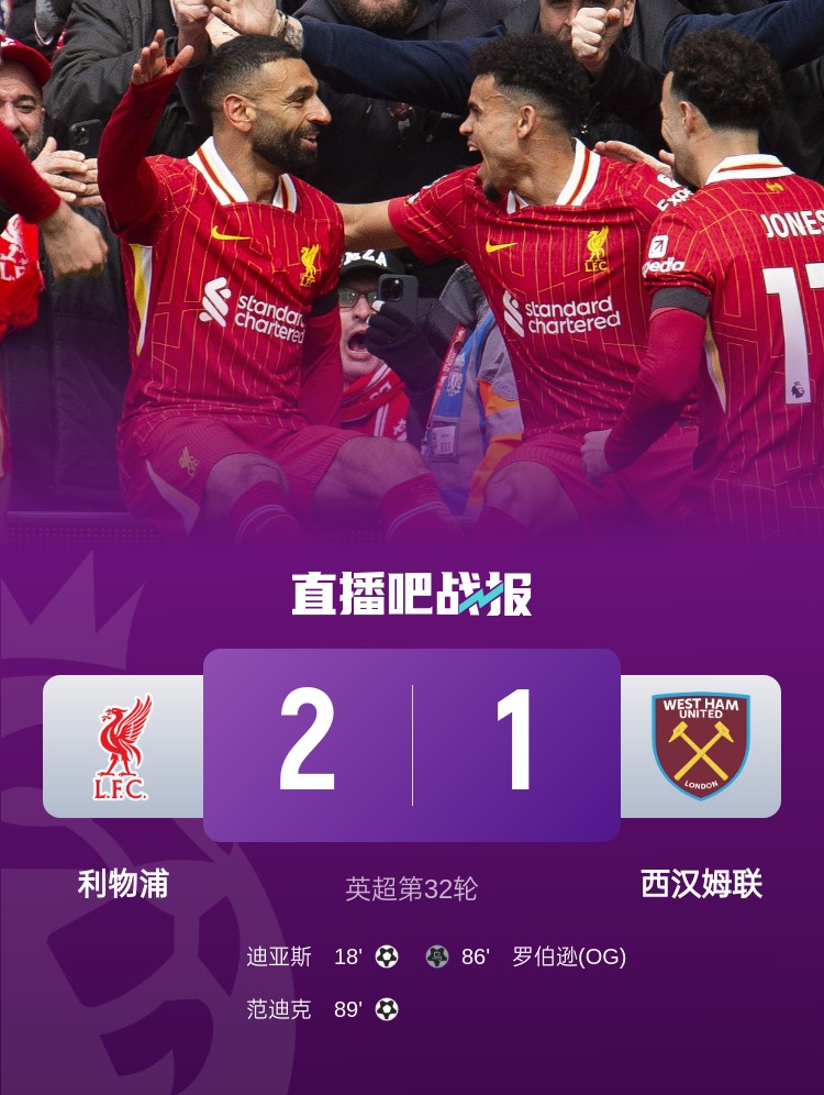 薩拉赫助攻路易斯-迪亞斯破門(mén),范迪克建功,最終利物浦2-1西漢姆,13分領(lǐng)跑積分榜。