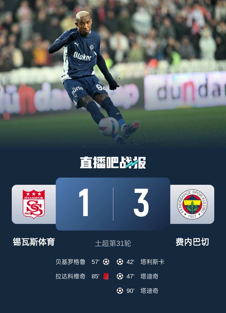 聯(lián)賽3連勝!費(fèi)內(nèi)巴切3-1錫瓦斯體育 塔利斯卡任意球塔迪奇雙響