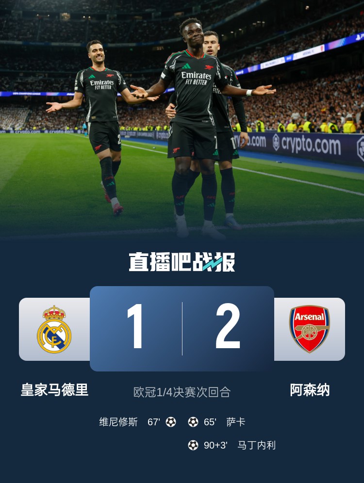 2024/25賽季歐冠1/4決賽:阿森納3-0皇馬,皇馬1-2阿森納
