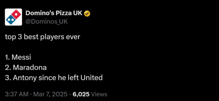 達(dá)美樂披薩吹圓神:歷史前三是梅西、馬拉多納、離開曼聯(lián)的安東尼