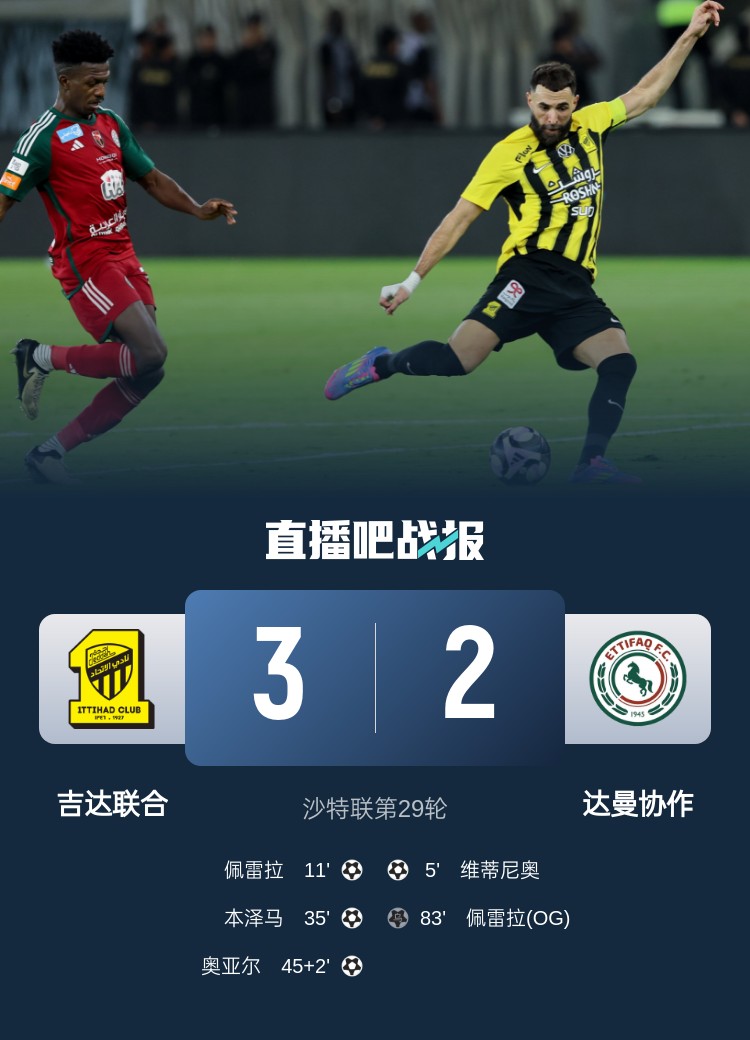 沙特聯(lián)-吉達聯(lián)合3-2達曼協(xié)作6分領(lǐng)跑 本澤馬傳射佩雷拉破門+烏龍