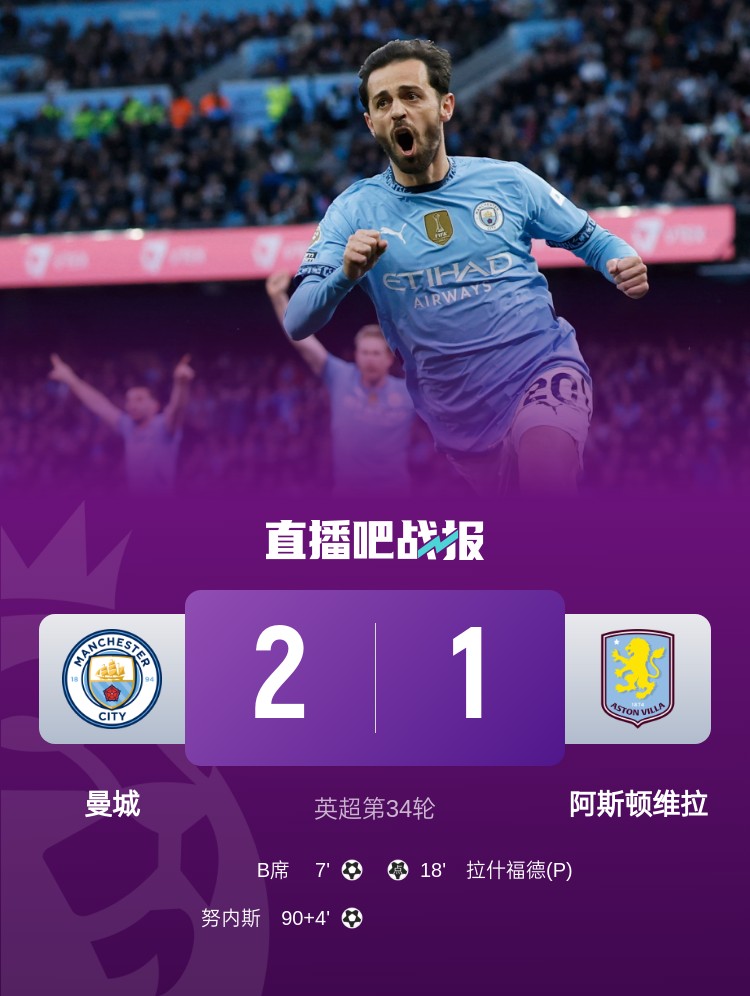 英超第34輪,曼城2-1戰(zhàn)勝維拉,終結(jié)維拉英超5連勝。上半場(chǎng),拉什福德開場(chǎng)中柱,隨后B席破門,迪亞斯送點(diǎn),拉什福德點(diǎn)射扳平;下半場(chǎng),馬爾穆什破門但越位無效,多庫(kù)94分鐘助攻努內(nèi)斯絕殺。