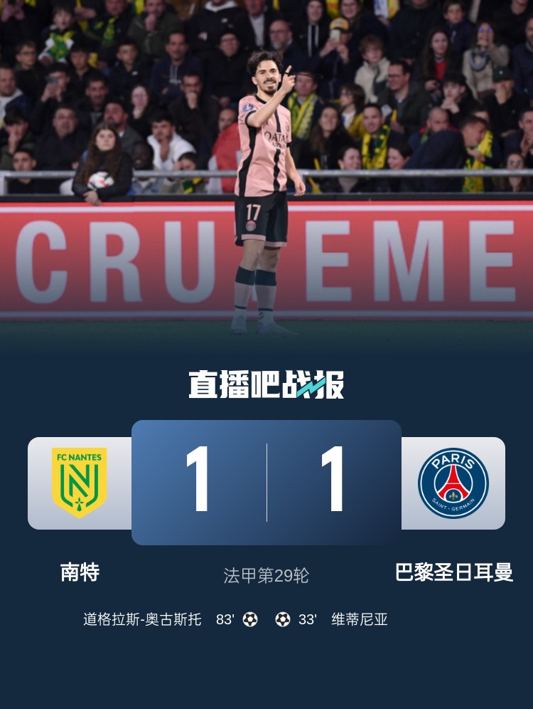 法甲第29輪,巴黎1-1戰(zhàn)平南特。上半場(chǎng),維蒂尼亞幫助巴黎取得領(lǐng)先;下半場(chǎng),道格拉斯-奧古斯托幫助南特扳平。
