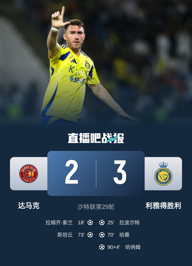 沙特聯(lián)第29輪,利雅得勝利客場(chǎng)3-2逆轉(zhuǎn)達(dá)馬克。上半場(chǎng),索蘭先拔頭籌,拉波爾特扳平比分;下半場(chǎng),哈桑替補(bǔ)反超,斯坦丘3分鐘追平,哈納姆補(bǔ)時(shí)94分鐘絕殺。