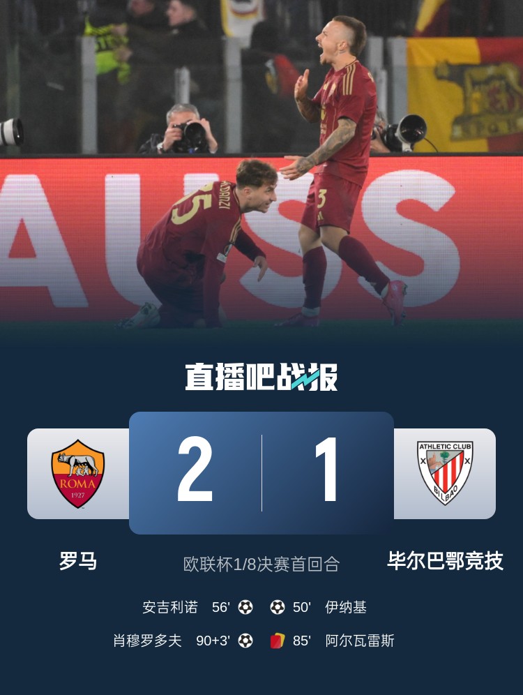 03月07日訊 歐聯(lián)杯1/8決賽首回合,羅馬主場(chǎng)2-1讀秒絕殺畢爾巴鄂競(jìng)技,占得先機(jī)。