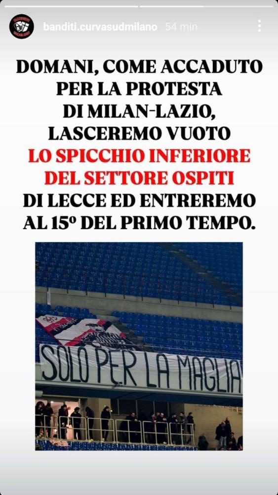 米蘭南看臺(tái)球迷組織在社交平臺(tái)上宣布:“明天,就像米蘭-拉齊奧時(shí)發(fā)生的抗議一樣,我們將會(huì)在萊切球場客隊(duì)坐區(qū)制造一片空?qǐng)?,我們將?huì)從上半場第15分鐘再進(jìn)場?!?/p>