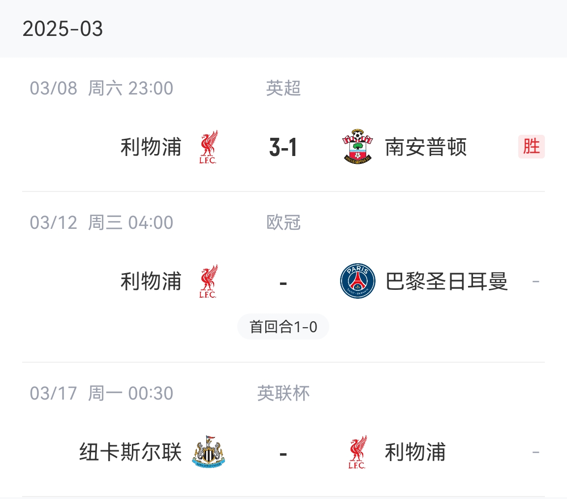 最終球隊(duì)3比1逆轉(zhuǎn)南安普頓,接下來(lái)球隊(duì)將在歐冠主場(chǎng)迎戰(zhàn)巴黎(首回合客場(chǎng)1-0),下周一凌晨,球隊(duì)將迎來(lái)與紐卡的英聯(lián)杯決賽,斯洛特將沖擊執(zhí)教球隊(duì)的首座獎(jiǎng)杯。